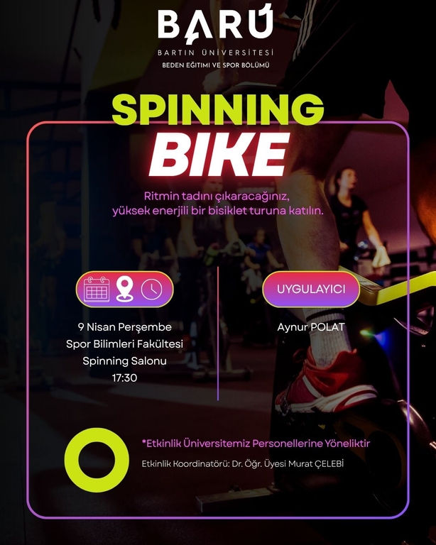 Bartın Üniversitesi personeli için özel olarak düzenlenen Spinning Bike etkinliği başlıyor! Ritmin tadını çıkaracağınız, yüksek enerjili bir bisiklet turunda bizimle buluşun.