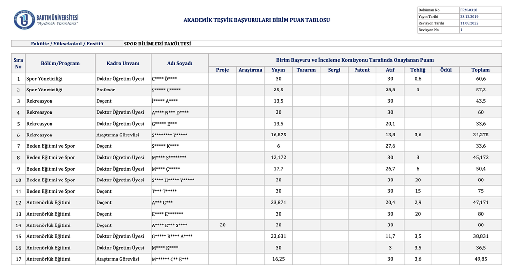 Bartın Üniversitesi Spor Bilimleri Fakültesi tarafından ilan edilen 2026 yılı Akademik Teşvik Başvuruları sonuçlarına göre, Beden Eğitimi ve Spor Bölümü öğretim üyemiz Doç. Dr. Sevim Handan Yılmaz, sergilediği üstün performansla akademik başarısını taçlandırdı